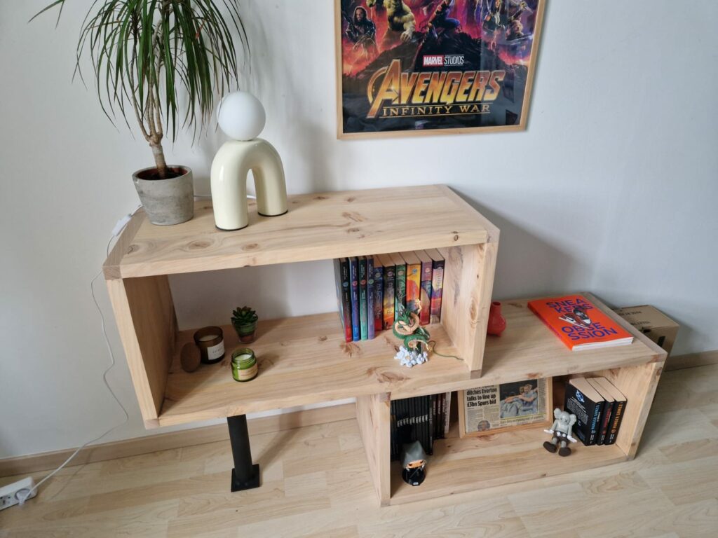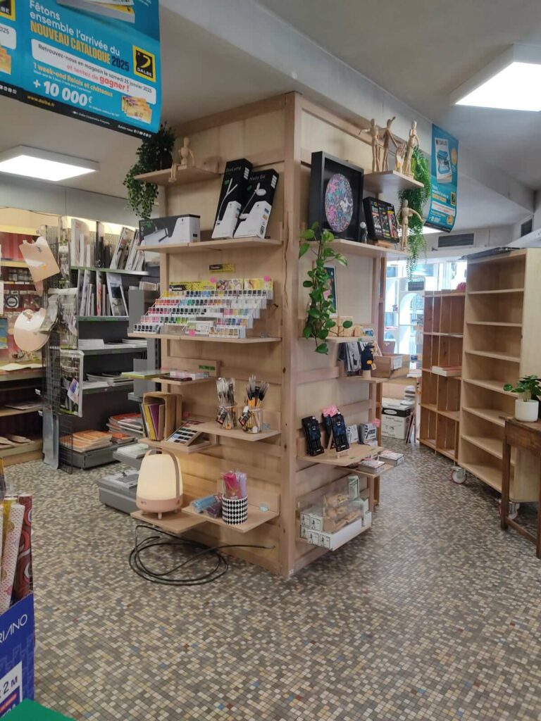 Un autre projet qui nous a pris un certain temps était l’habillage d’un pilier en béton dans le magasin de Dalbe-Grassin en centre ville de Poitiers . Nous avons construit le projet avec eux et avons innové avec des étagères amovibles sans visserie et outils