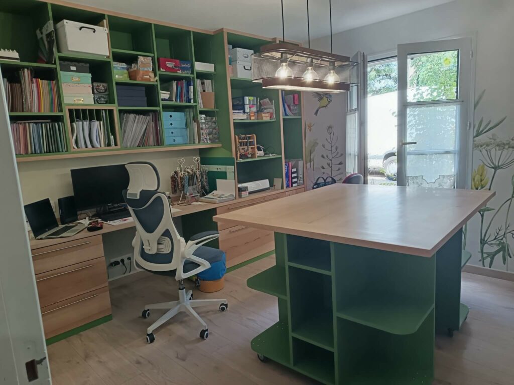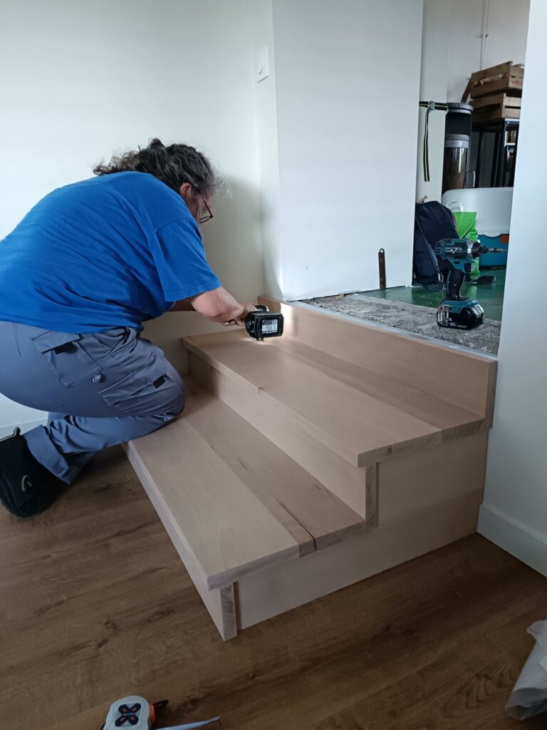 D’autres projets ont vu le jour, l’aménagement d’une pièce avec îlot central et l’habillage d’un mur avec des étagères et un plan de travail, des marches en hêtre, un meuble de chambre pour ranger des livres…