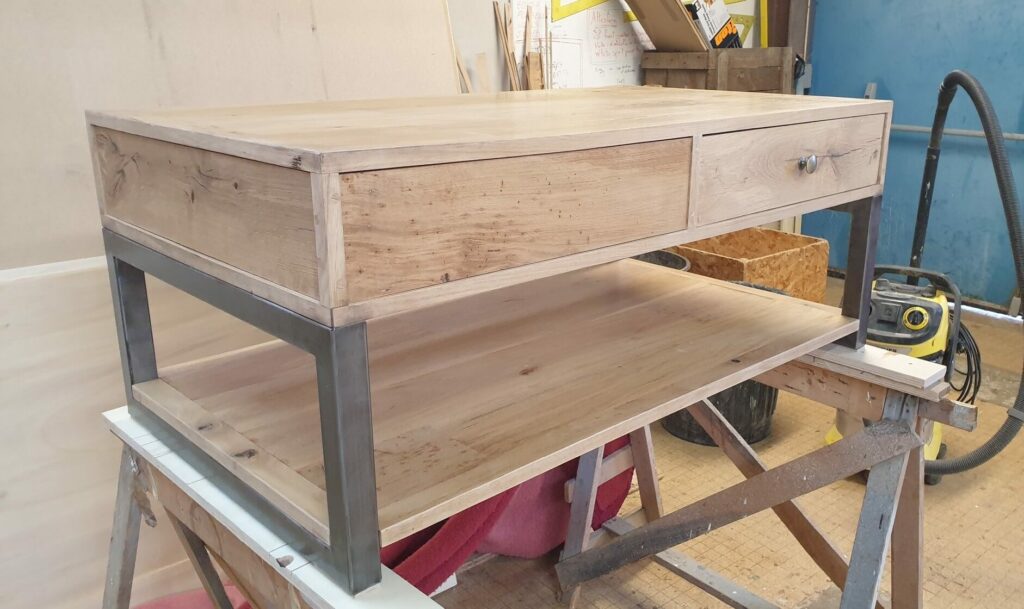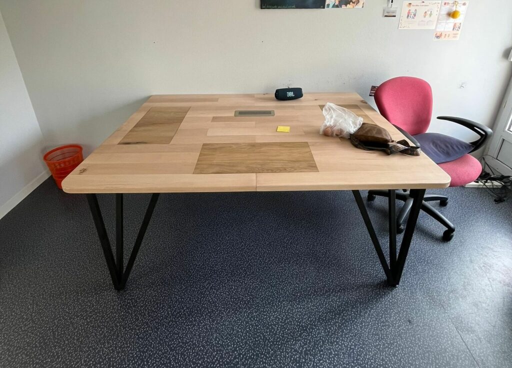 Pour la partie mobilier, nous avons fabriqué une petite table en chêne avec un piétement en métal. L’équipe s’est formée à la soudure et nous avons commencé à réaliser notre propre piétement. Dans le même style, nous avons fabriqué une table en hêtre sur des piétements maison en forme de triangle.